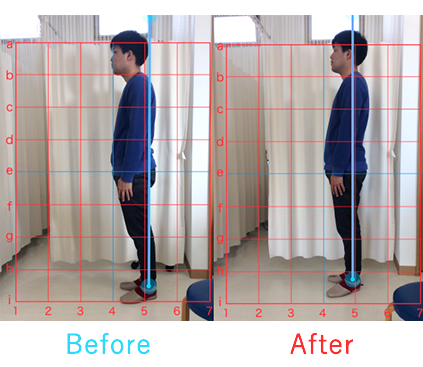 来院時は痛みをかばって歪んだ姿勢で入ってこられましたが、治療後には痛みが軽減し、 背筋を伸ばして帰ることができました。