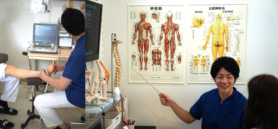 最初に患者様の症状など詳しくお聞きし、痛みの原因をエコーや骨模型などを使い視覚的に患者様にわかりやすく説明します。