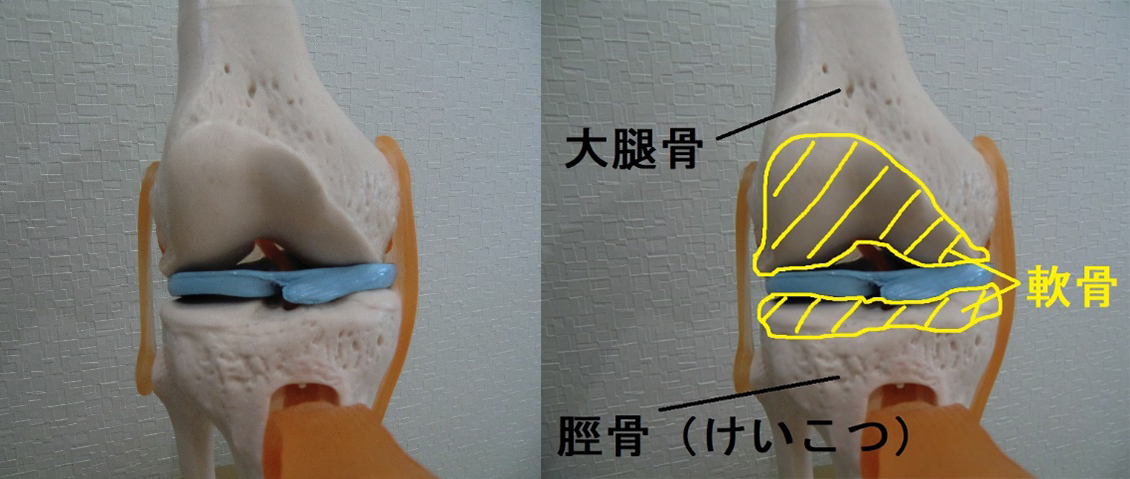 膝の骨は写真のような形をしています。実は骨の端には軟骨というクッションがあります。