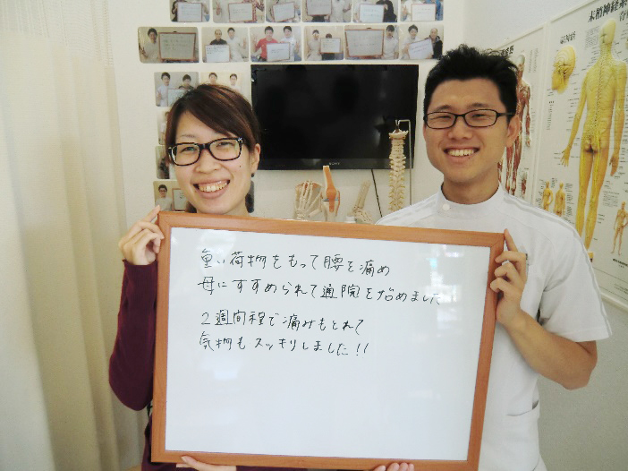 おざき先生を含め、スタッフの方もとても親しみやすく本当にいい治療院に入ったものだと思い、偶然とはいえいい縁に恵まれたものだと喜んでいます。職場にも腰痛もちの人がいるため自信を持って紹介させて頂いています。本当にありがとうございました。