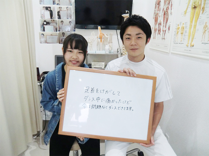 • •【主訴】ダンスをしていて足首を捻挫した、足首の痛みはよくなったが内側に痛みが残っている、ダンスの大会が1か月後にあるため早く治したい。